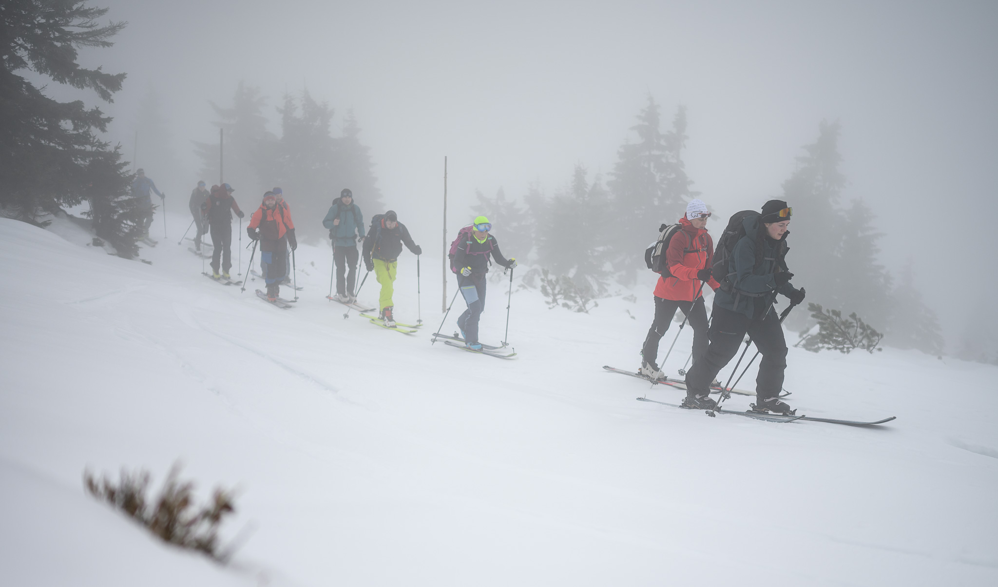 Sobota přinesla psí horské počasí, neboli pro Krkonoše typickou "Hančovinu" v podobě mlhy, větru, teploty kolem nuly s pocitovou teplotou atakující minus deset. Však také trasa připravená pro účastníky Zažij skialpy vedla i kolem pomníku Hanče a Vrbaty, tragicky zesnulých lyžařů při závodě v roce 1913.